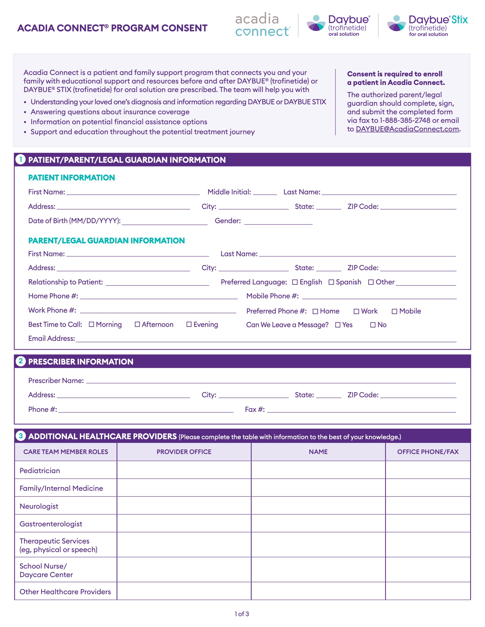 Acadia Connect® is a patient and family support program that connects you and your family with educational support and resources before and after DAYBUE® or DAYBUE® STIX for oral solution are prescribed.