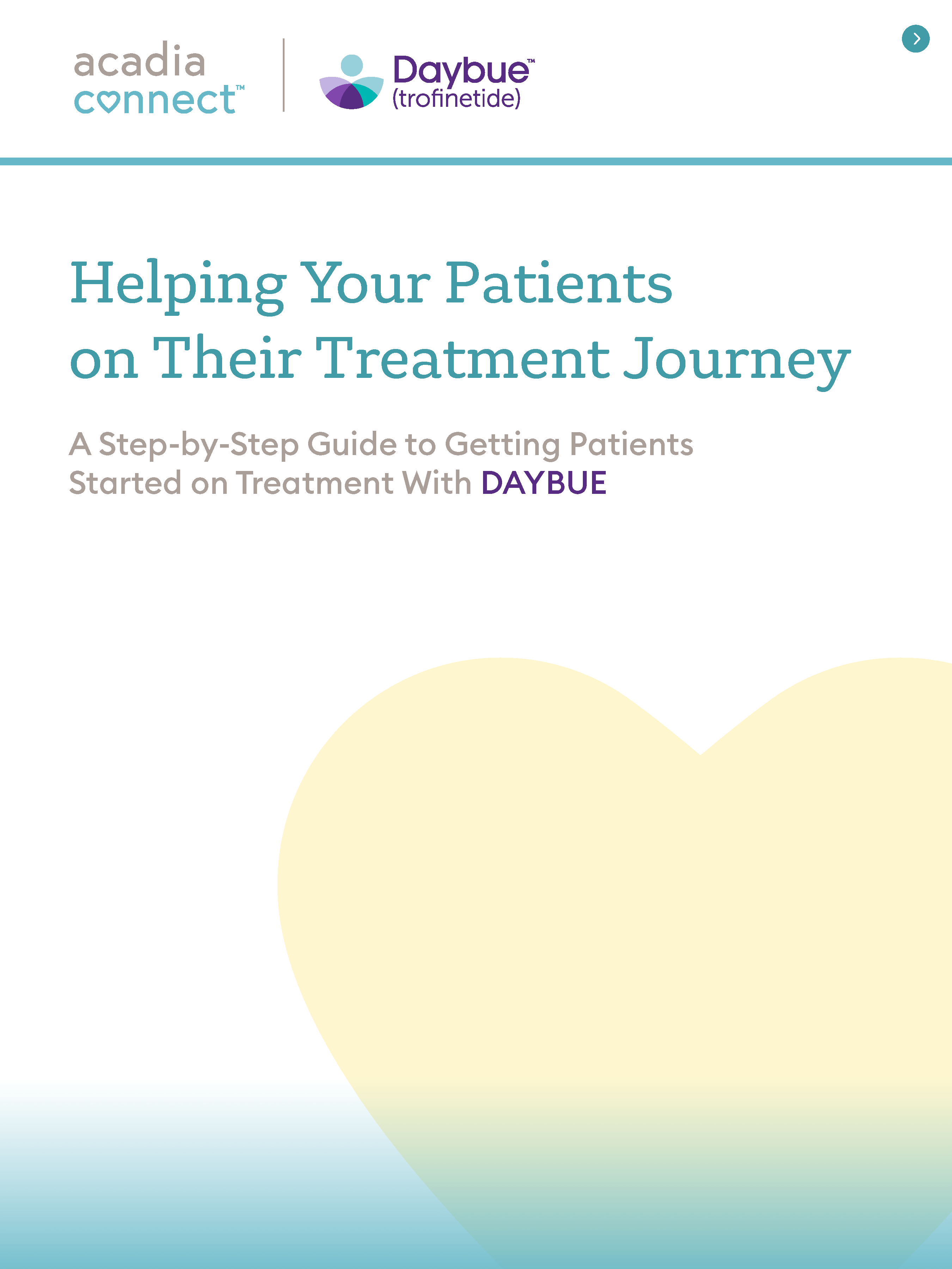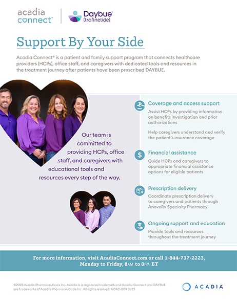 A guide to help set expectations for you and your practice when prescribing DAYBUE, and highlights support available from Acadia Connect.