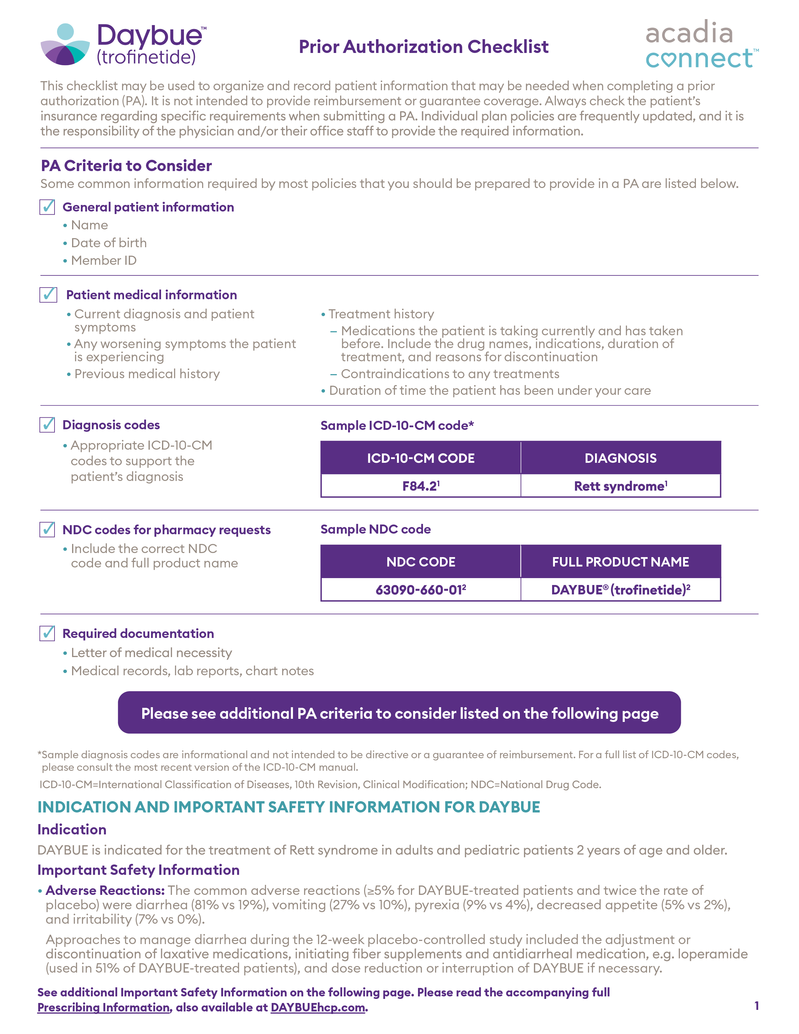 A guide with information on accessing DAYBUE and receiving coverage support (eg, help with prior authorizations and appeals) through Acadia Connect.