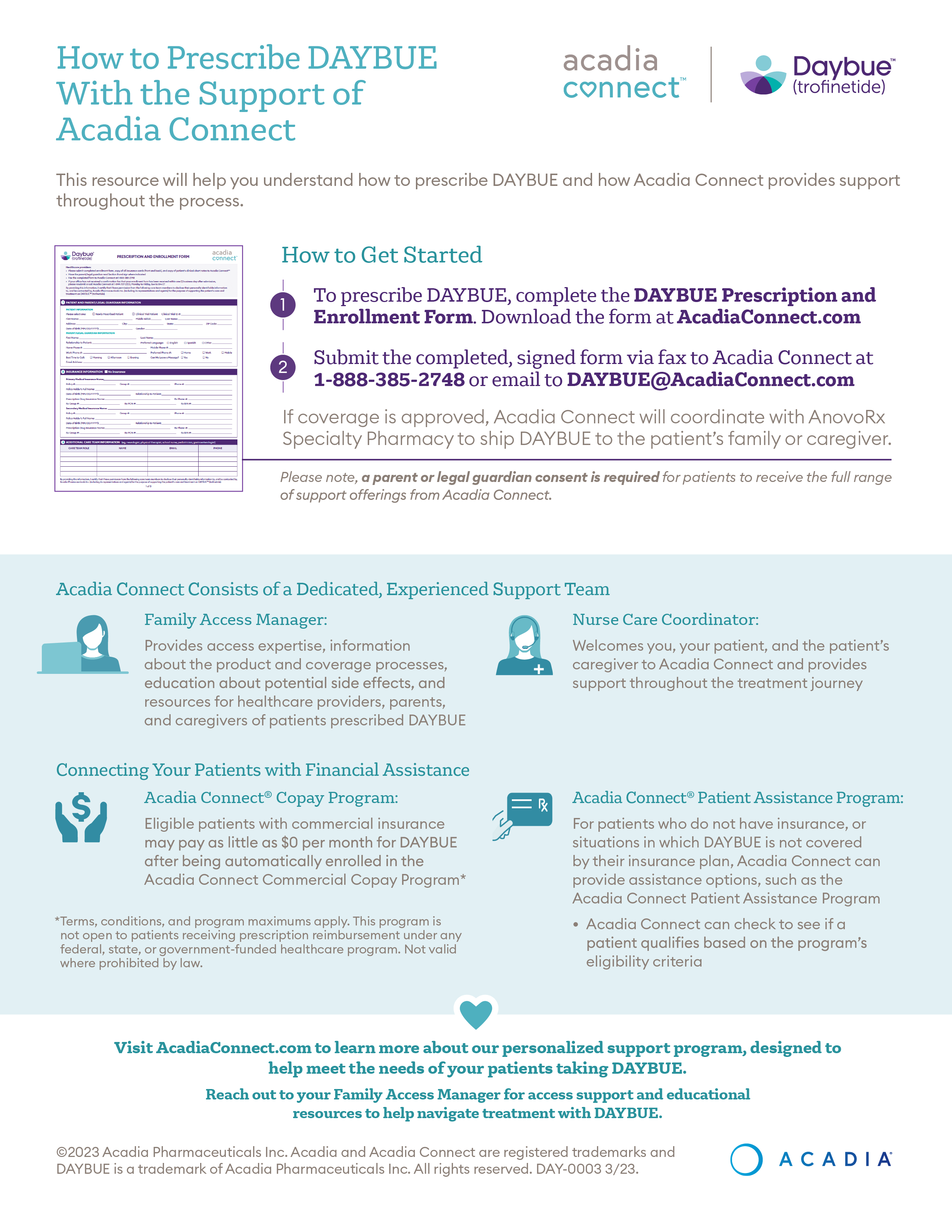 Form used to prescribe DAYBUE to your patients and enroll them in Acadia Connect (with consent from the parent/legal guardian).