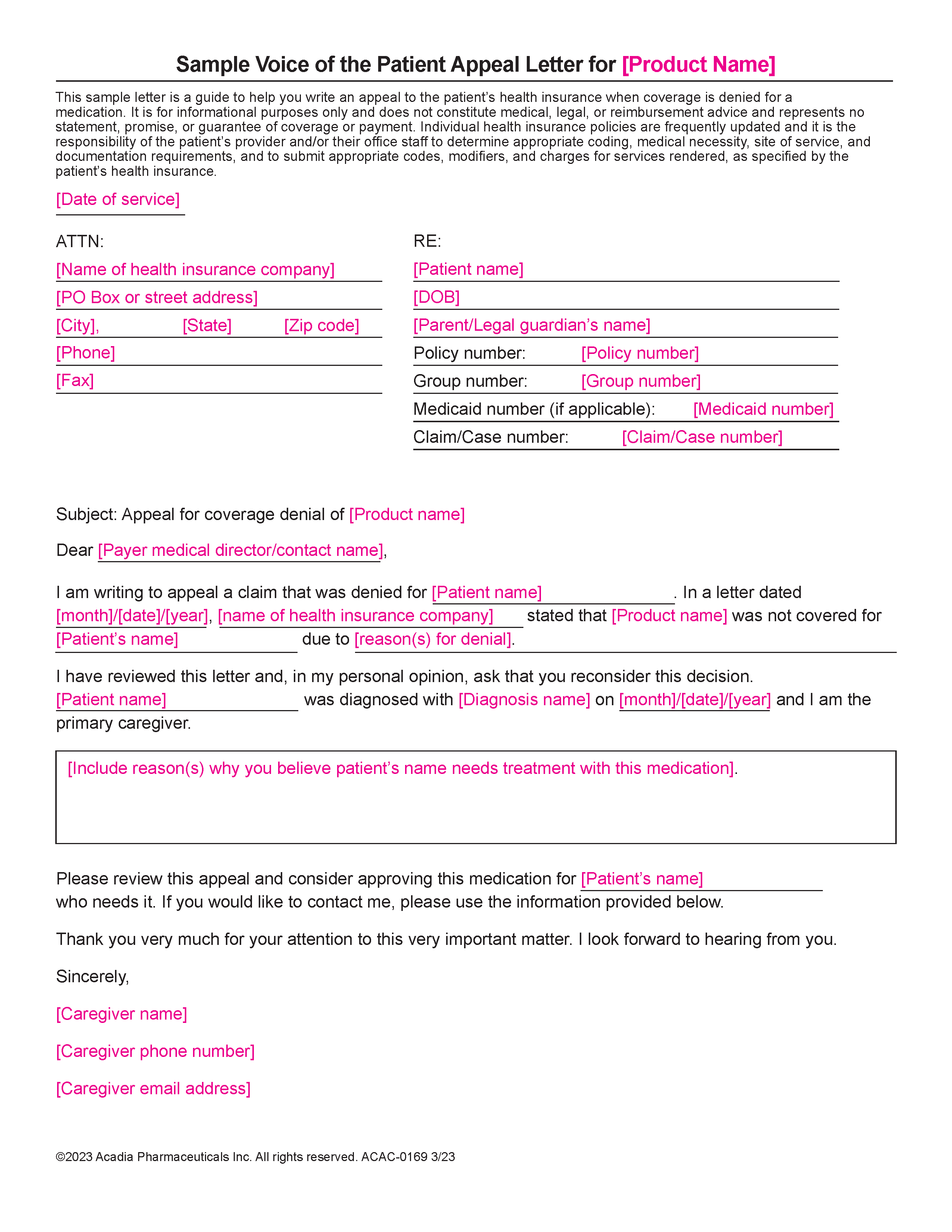 A letter template for your patient’s caregiver to request a reversal of the health plan’s coverage denial for DAYBUE.